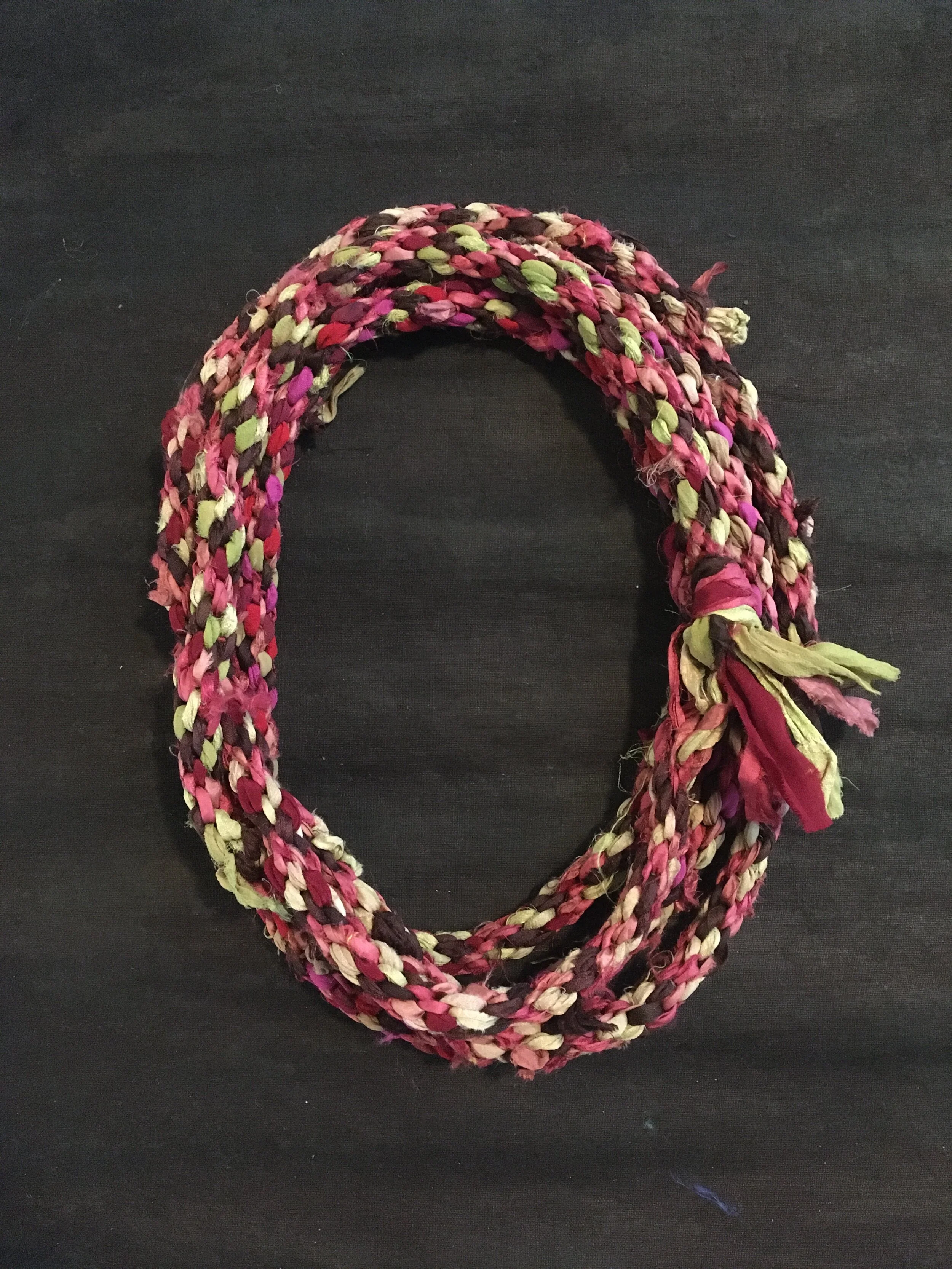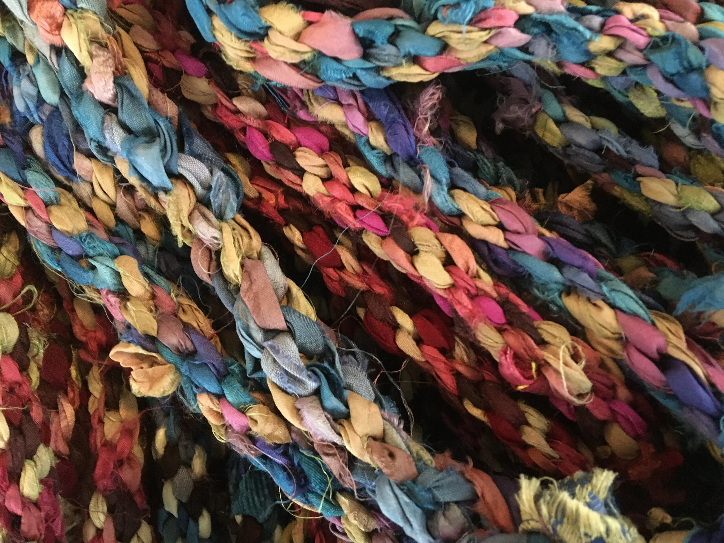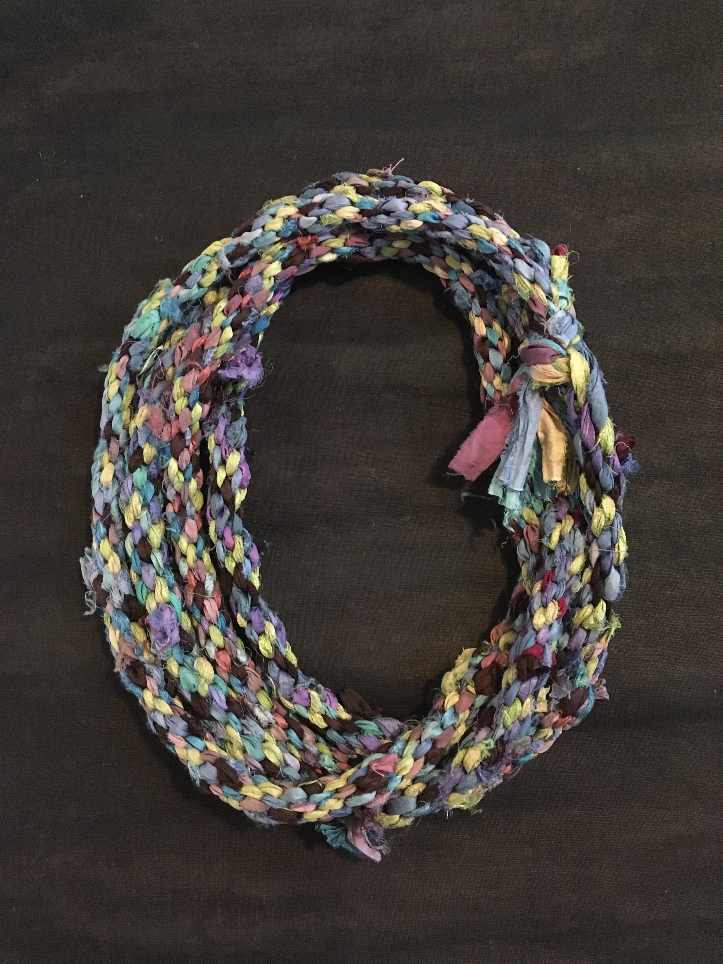These necklaces are made from yarn created from strips of reclaimed saris (mostly silk, but sometimes other fibers) sewn together to form balls of reusable fiber. The colors and textures change slightly as the garment patterns unravel with the deconstruction. Seam ends (1/2” connections of strips) add texture throughout. This eco-friendly process provides sustainable employment for women in Nepal and India who are partnered with the company Darn Good Yarn. I braid these strips into round, springy thick corded loops that can be tripled or quadrupled to make a soft and colorful necklace. The loops are 96” long loops, about 1/2” thick with ends knotted together.