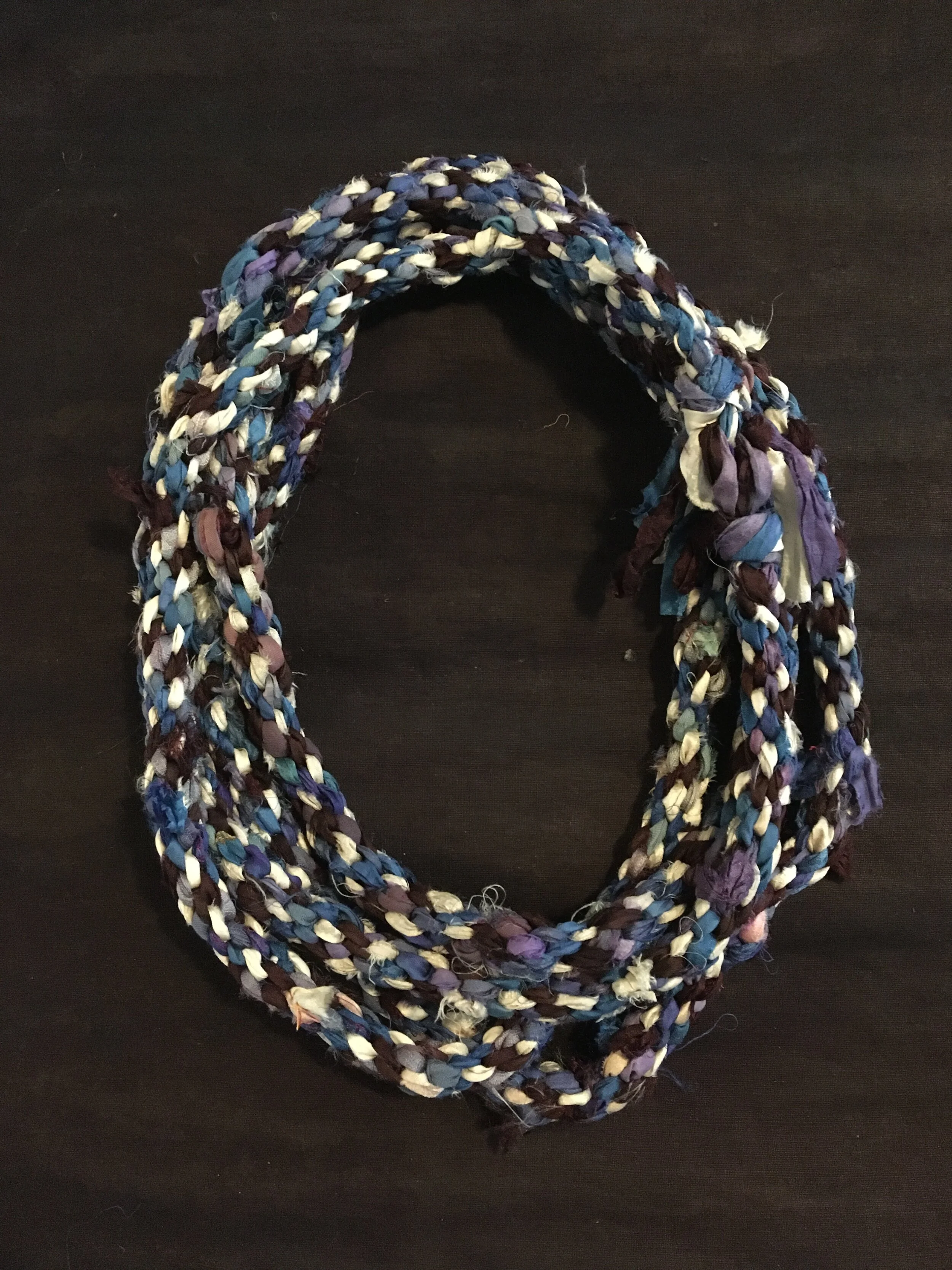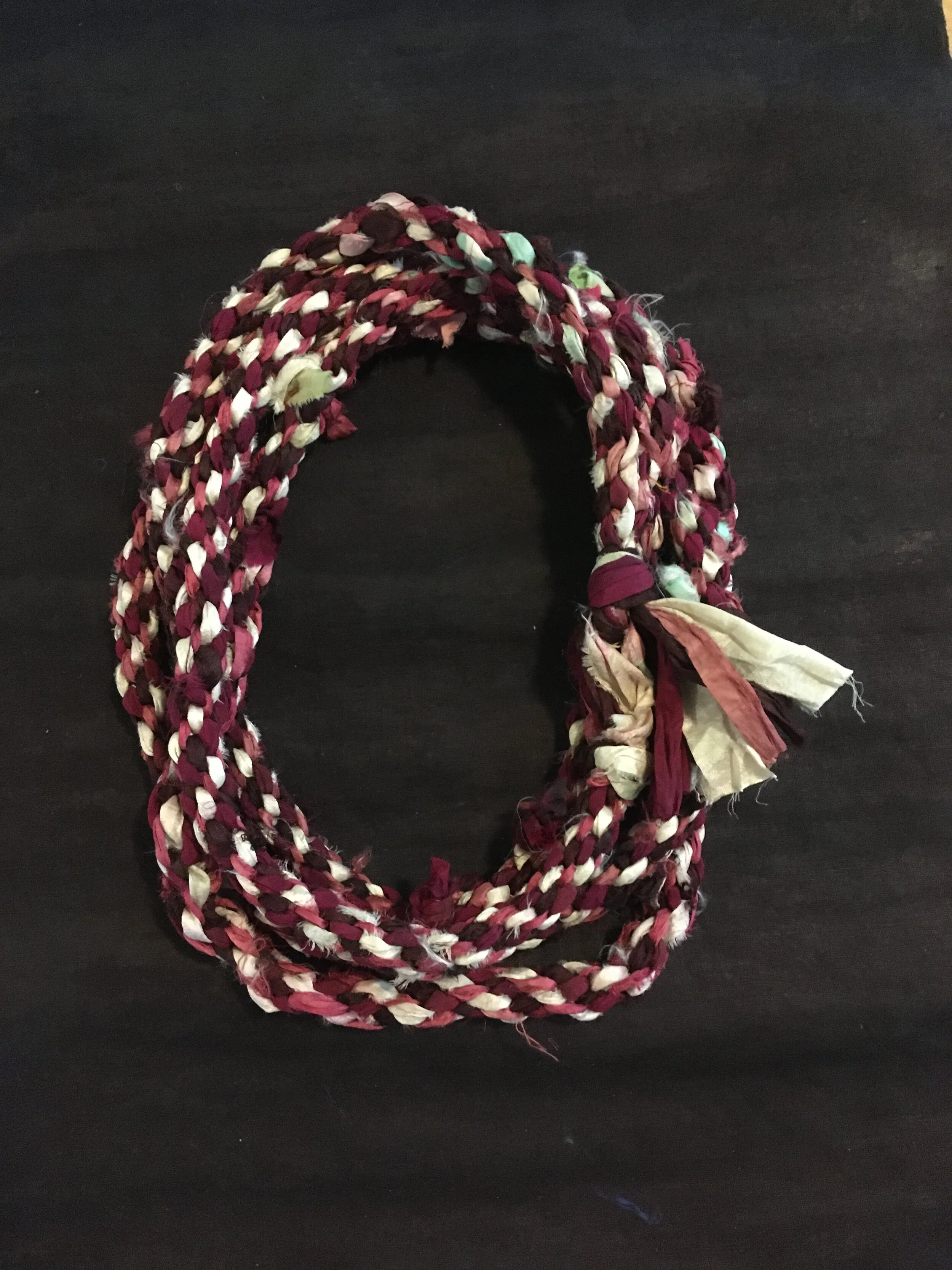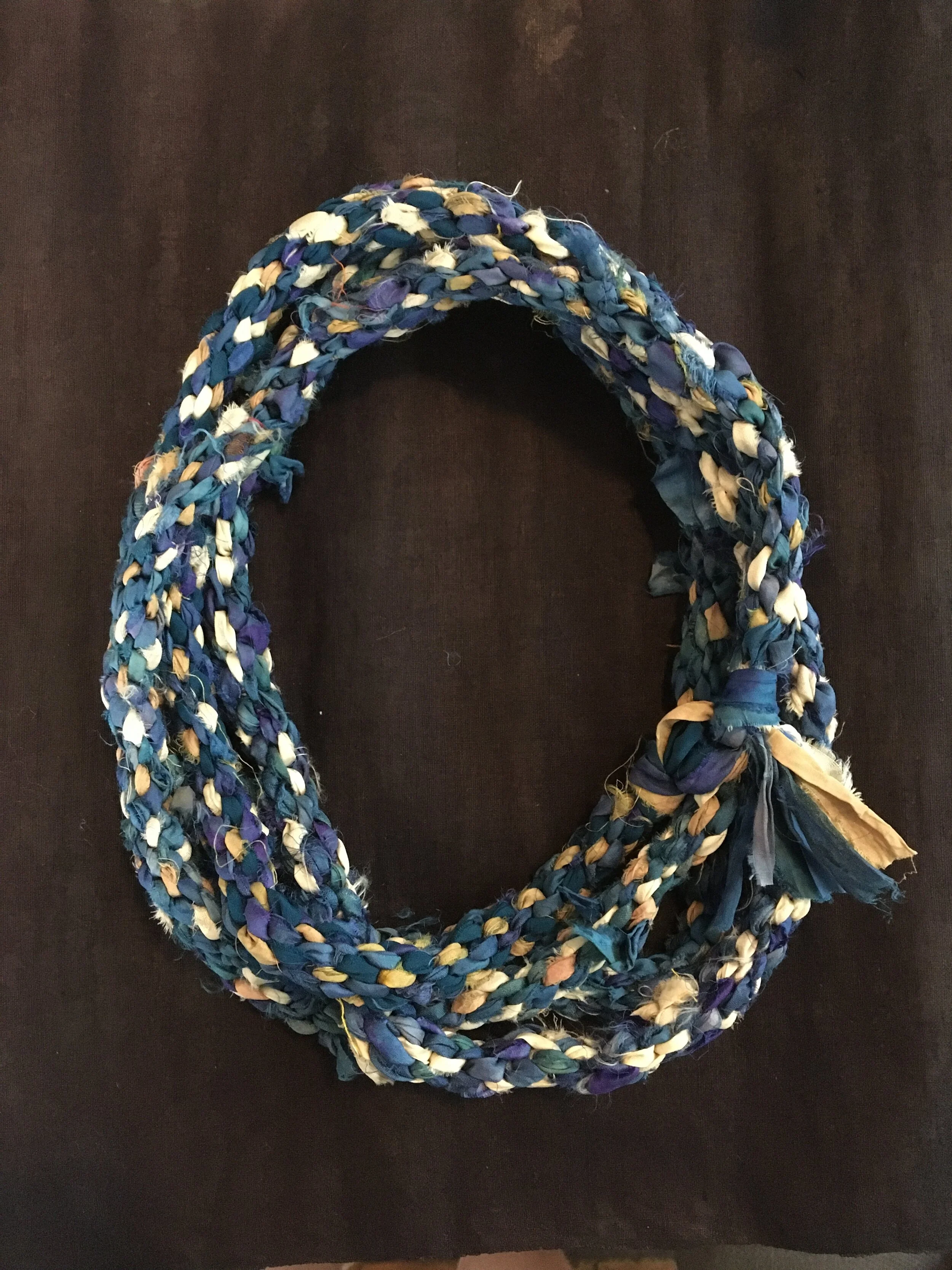 These necklaces are made from yarn created from strips of reclaimed saris (mostly silk, but sometimes other fibers) sewn together to form balls of reusable fiber. The colors and textures change slightly as the garment patterns unravel with the deconstruction. Seam ends (1/2” connections of strips) add texture throughout. This eco-friendly process provides sustainable employment for women in Nepal and India who are partnered with the company Darn Good Yarn. I braid these strips into round, springy thick corded loops that can be tripled or quadrupled to make a soft and colorful necklace. The loops are 96” long loops, about 1/2” thick with ends knotted together.