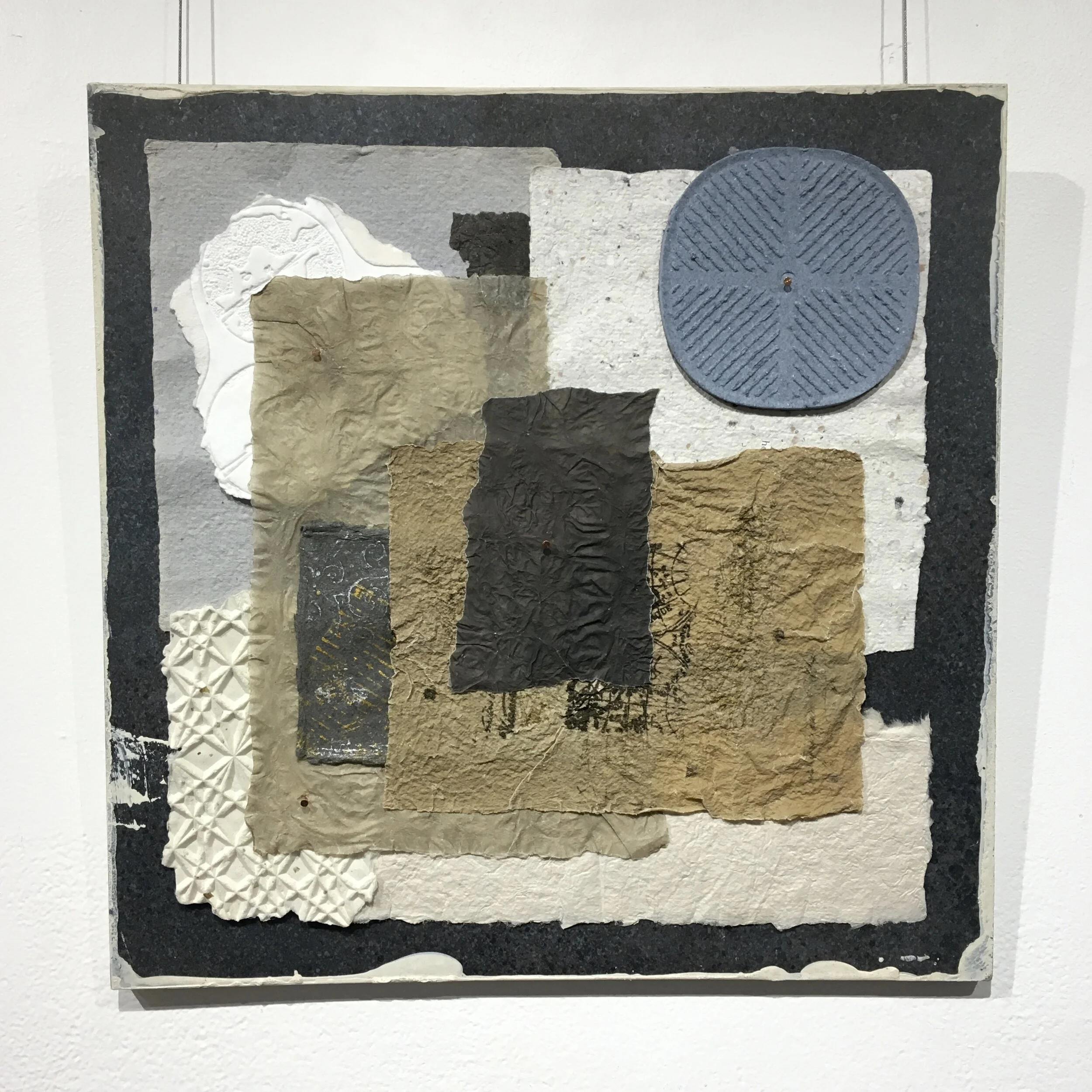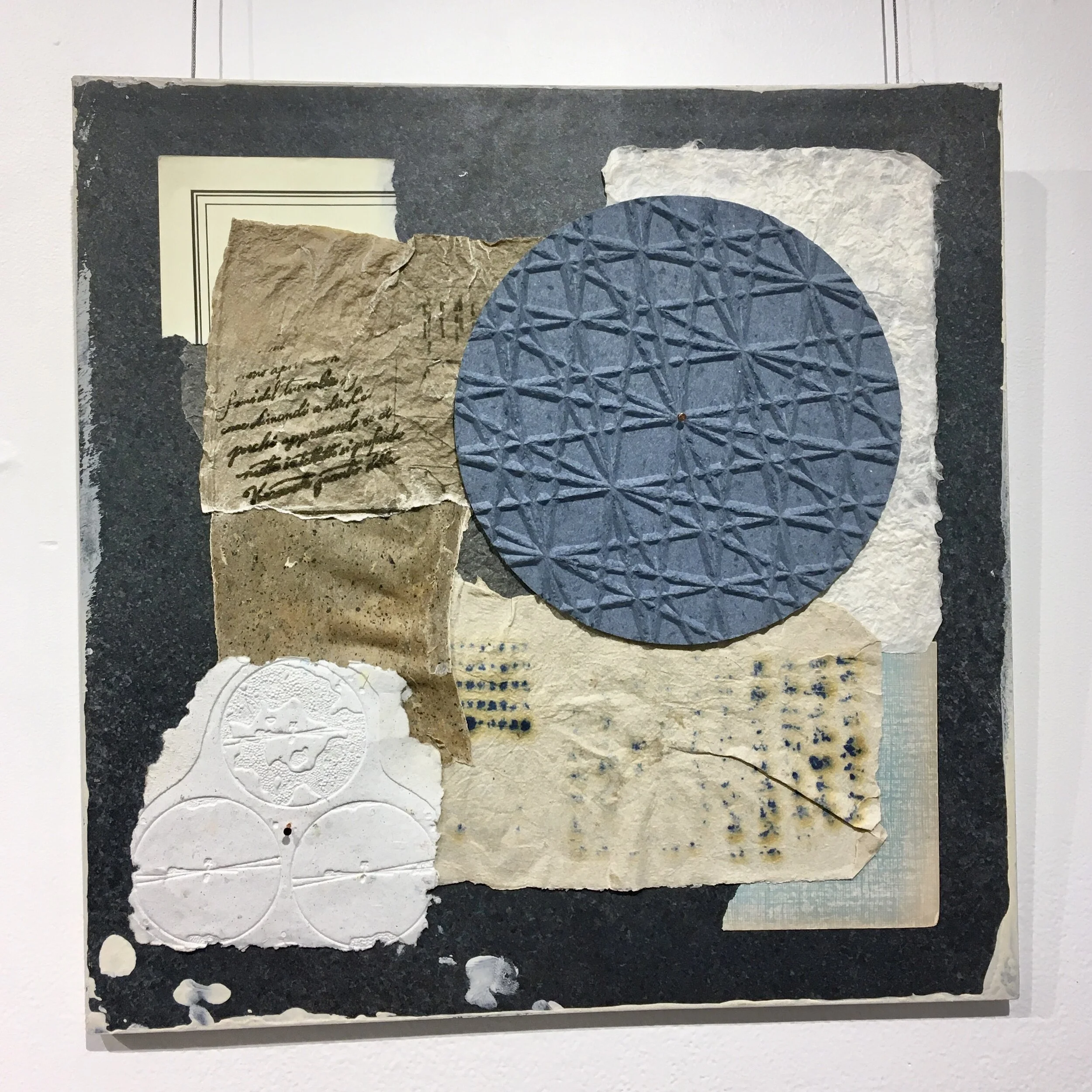 Recently, I have started using those bits. I had been given some old display shelving that had some lovely paint splattered around the edges of the “back” sides - a perfect substrate since I prefer to avoid buying anything new. I combined some of the old paper bits with new shapes made with recycled pulps formed on found objects with dramatic textures (colanders, printing blocks from a geological survey publication, backs of serving trays). Some of the old bits needed to be dampened and ironed to make them flat enough for the collage, and the ironing created new textures and revealed the inner tensions of the paper - another layer of intrigue and interaction.